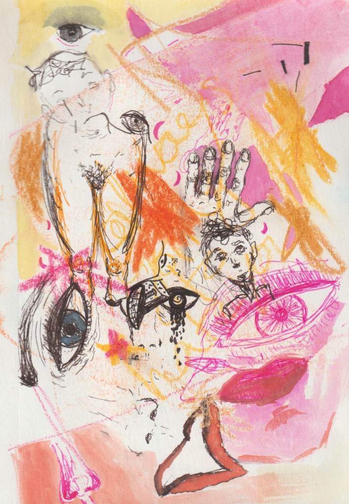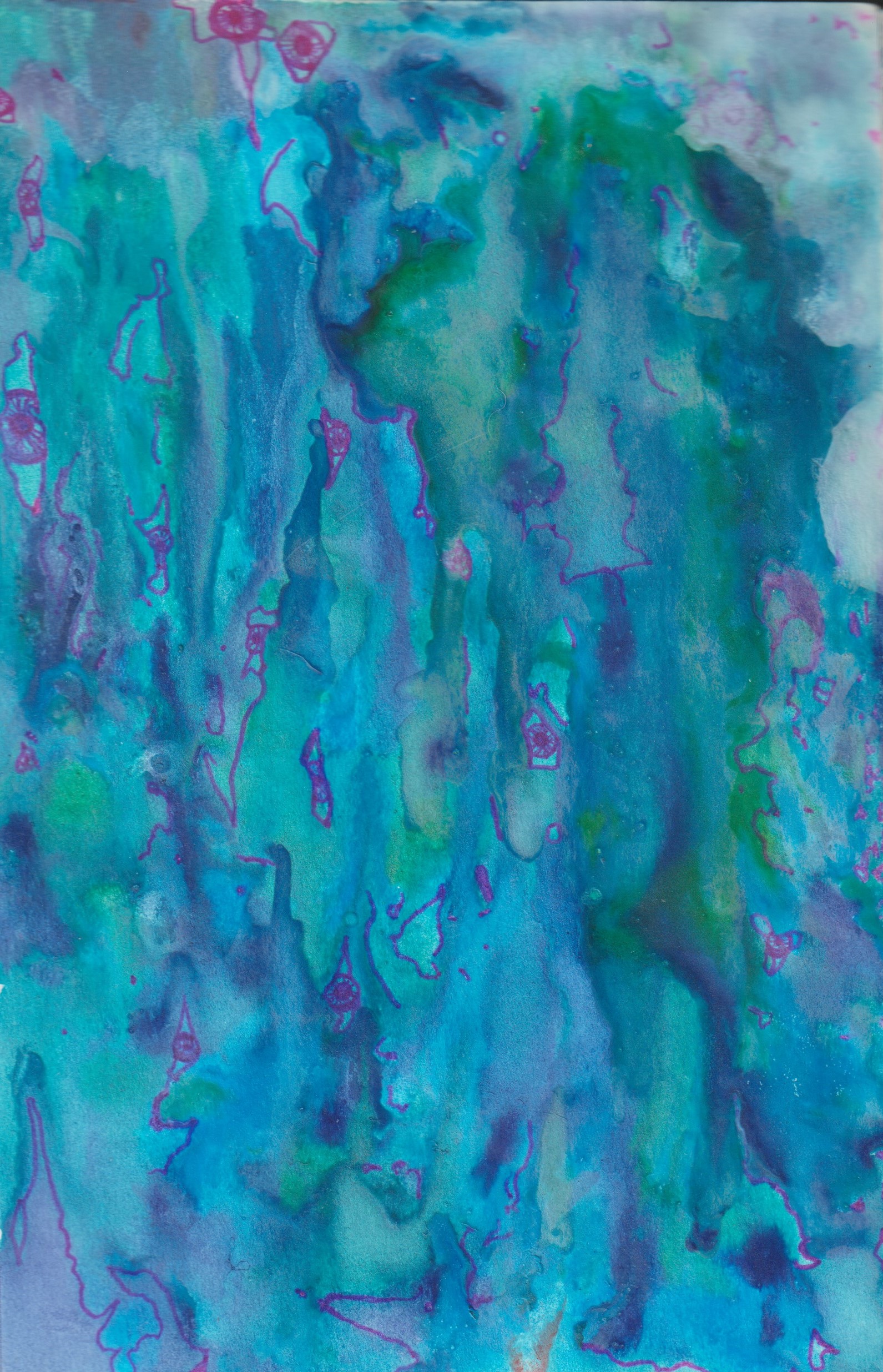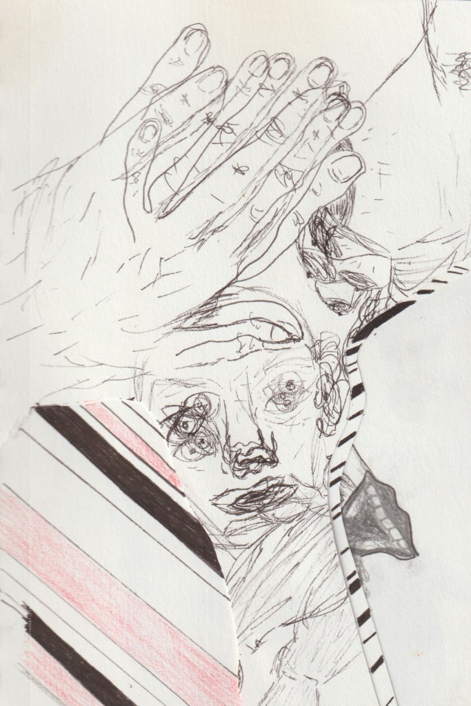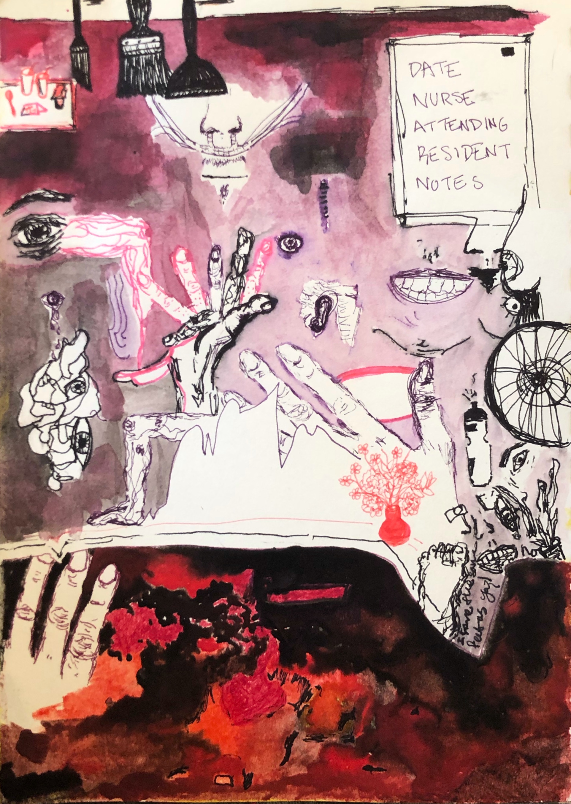 Using ink, crayon, water color, and pastel, these works seek to express the pains and pleasures of embodiment. Some grapple with death and dying, others with memory, childhood, and the role of a caretaker. They niether seek to shock nor to attend to the healing of the viewer, rather they use banal and pedestrian images to distort perspective and loosen the edges of body and object.